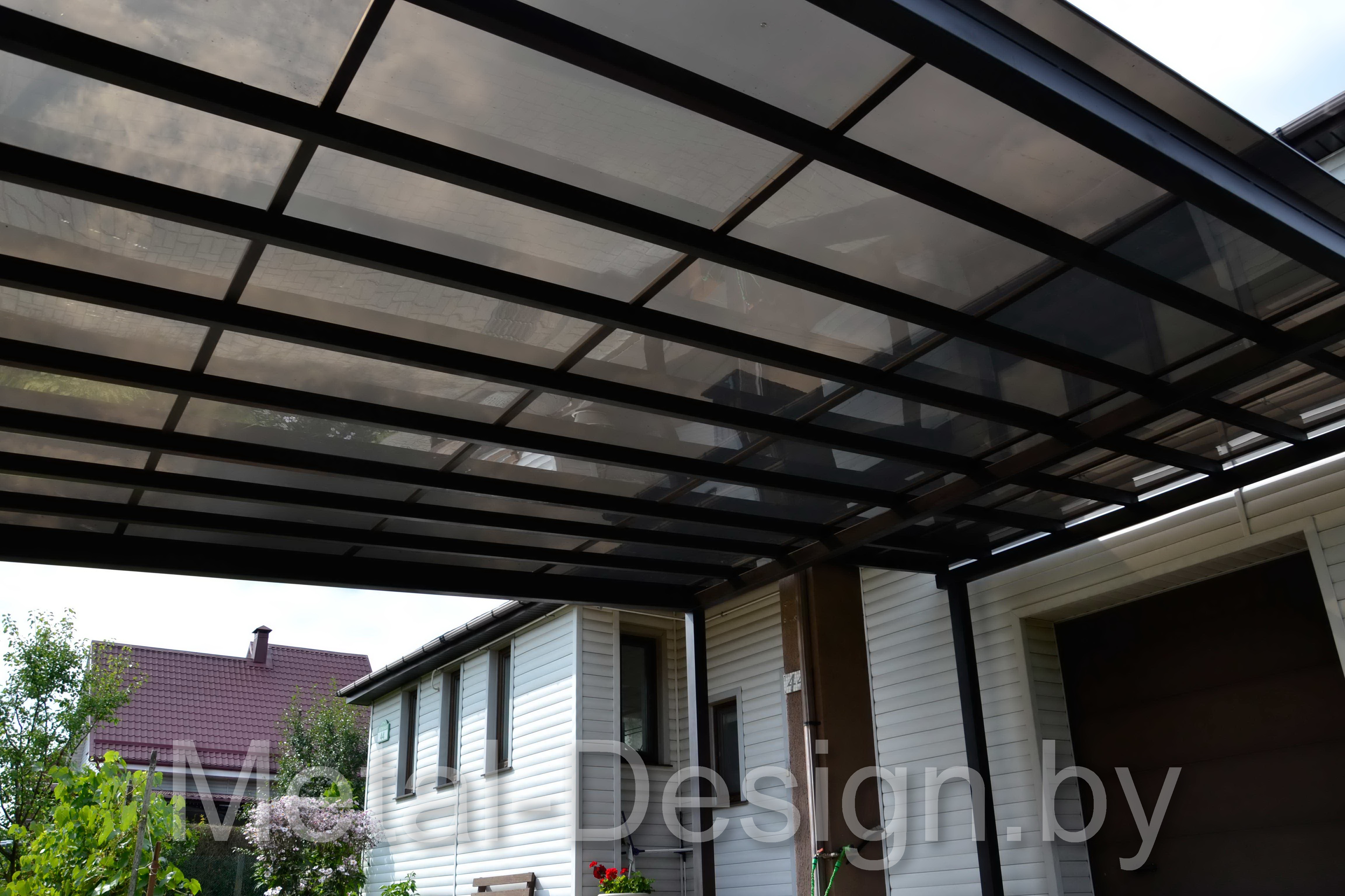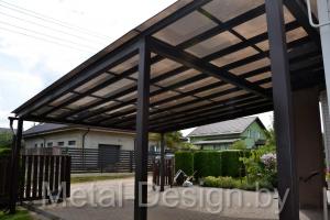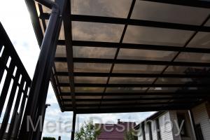 На данном объекте применялись столбы профильные, сечением 120*120 мм. Они установлены на бетонные опоры, которые заглублены на 1.5. мощный каркас навеса позволяет расположить на кровле листы монолитного поликарбоната, спрятав их соединение.