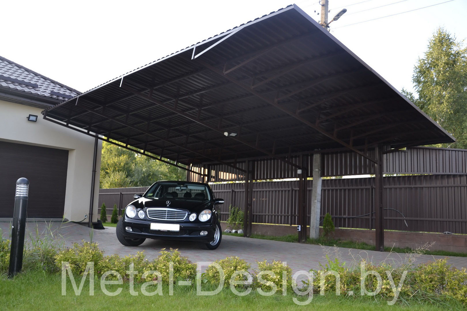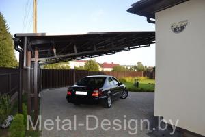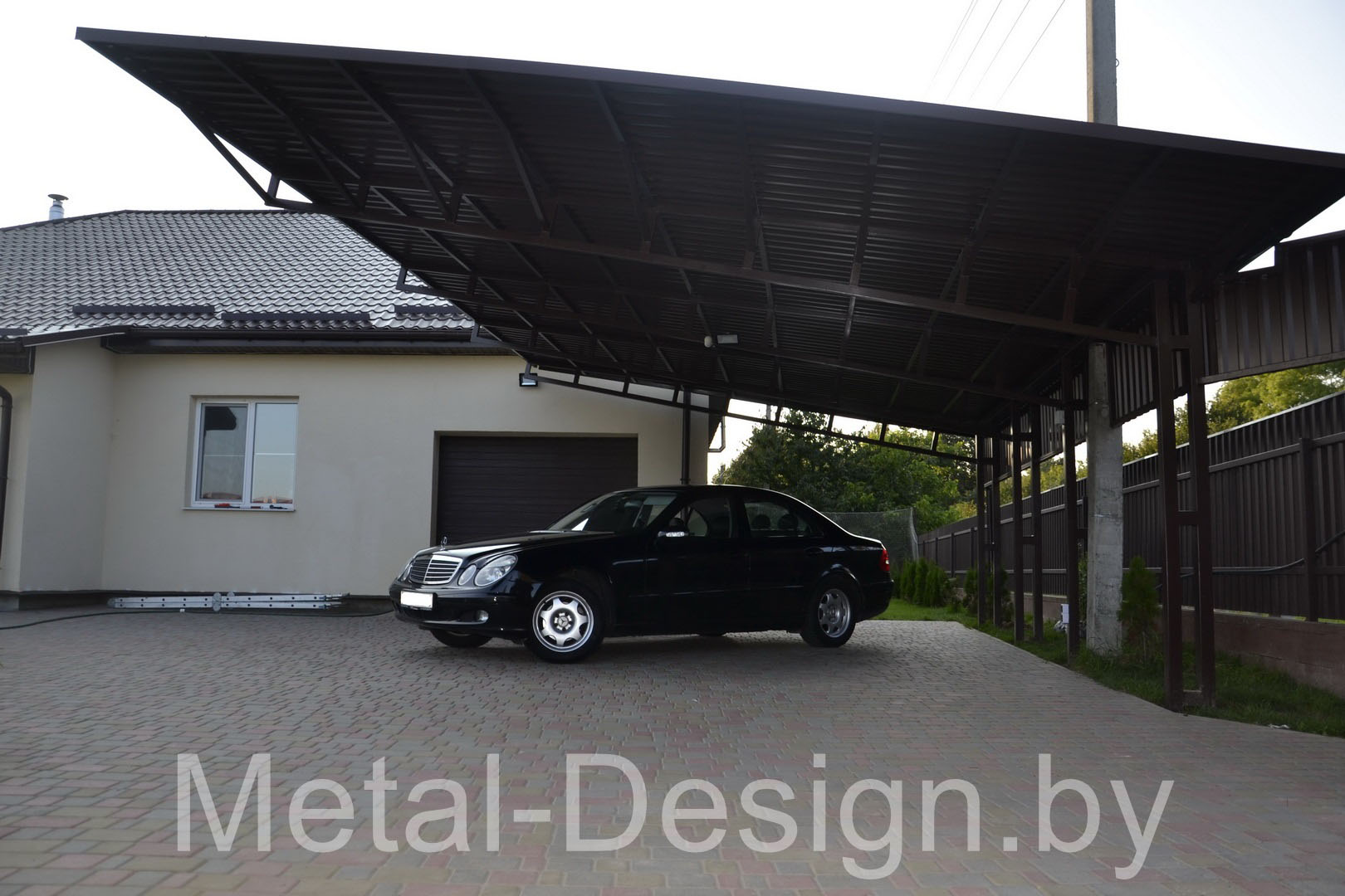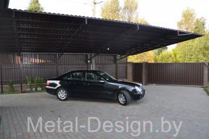 Комплектация: Навес смонтирован на сдвоеные опоры 80*80*3 мм. Фермы трапециевидные 60*40*2 мм. Связи ферм 40*40*2. Материал крыши- кровельный металлопрофиль производства РБ. Грунт и эмаль производство РБ. Водосточная Система производство Польша.