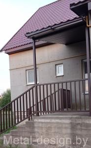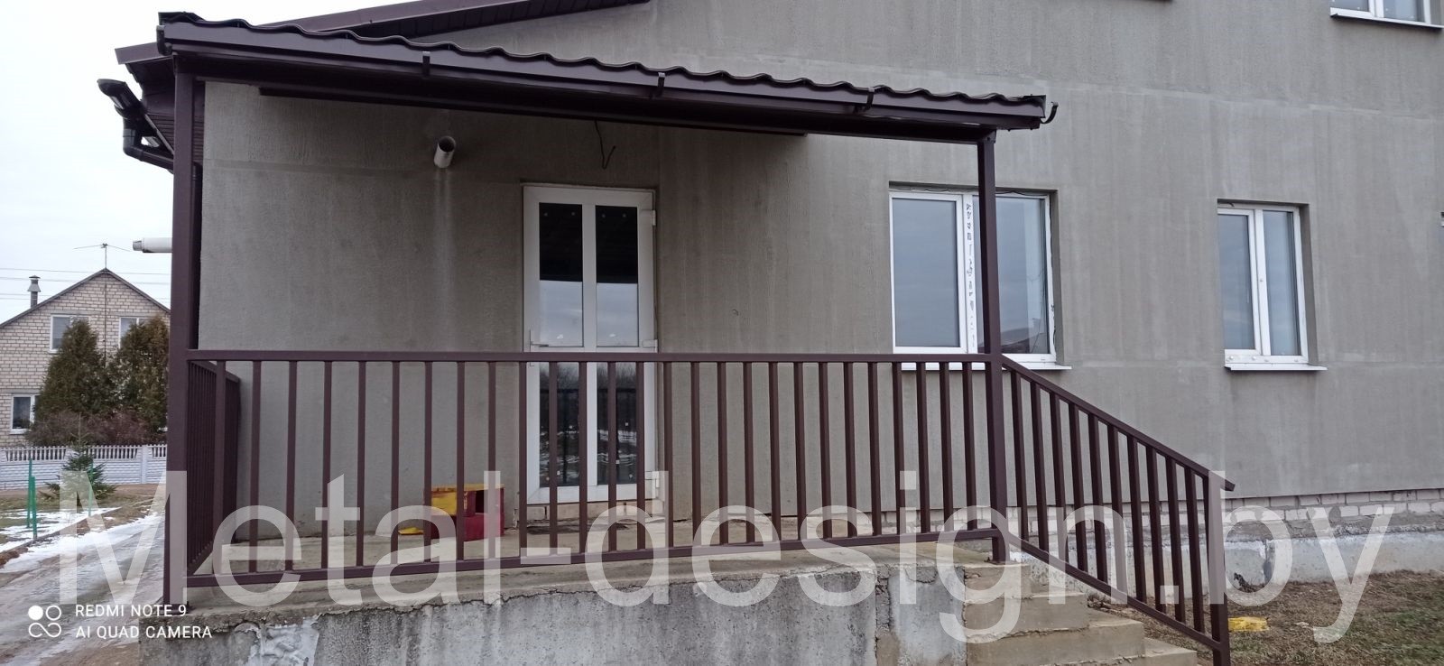Комплектация: Навес накрыт металлопрофилем производителя РБ. потолок навеса подшит сайдингом из металла. Грунт и эмаль производства Россия.