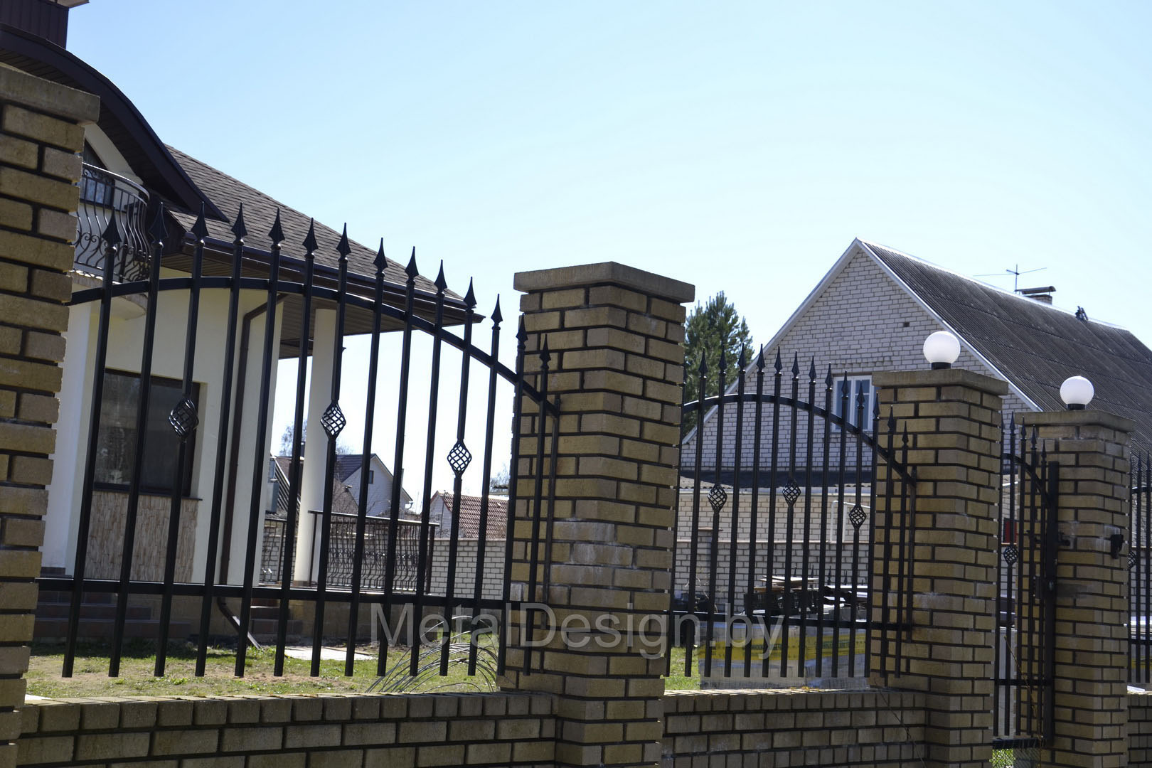 Главная / Наши работы / Сварные заборы и заборы из профлиста / Сварной забор на кирпичных столбах с пиками