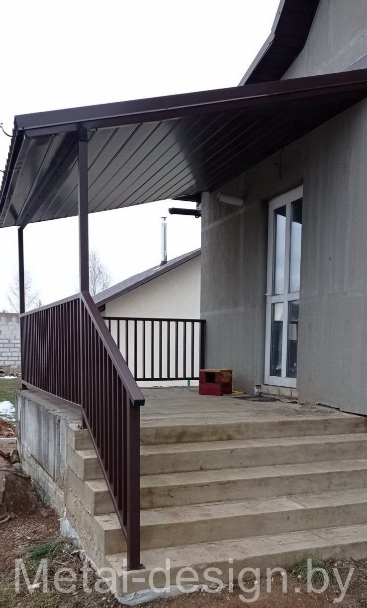Комплектация: Навес накрыт металлопрофилем производителя РБ. потолок навеса подшит сайдингом из металла. Грунт и эмаль производства Россия.