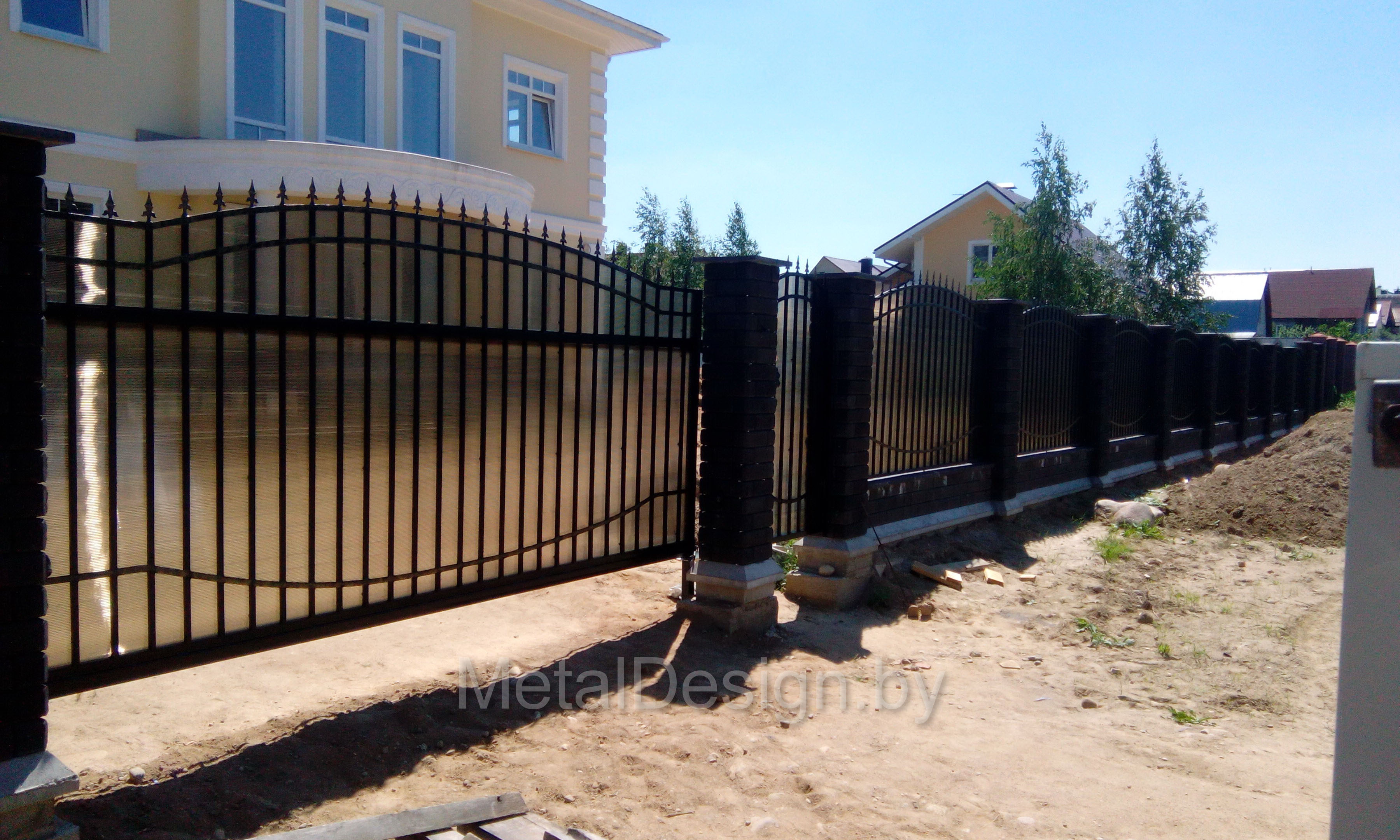 Откатные ворота собраны из профилей 20х20х2, связанных декоративной гнутой полосой. Имеют скрытые направляющие и удерживающие элементы.